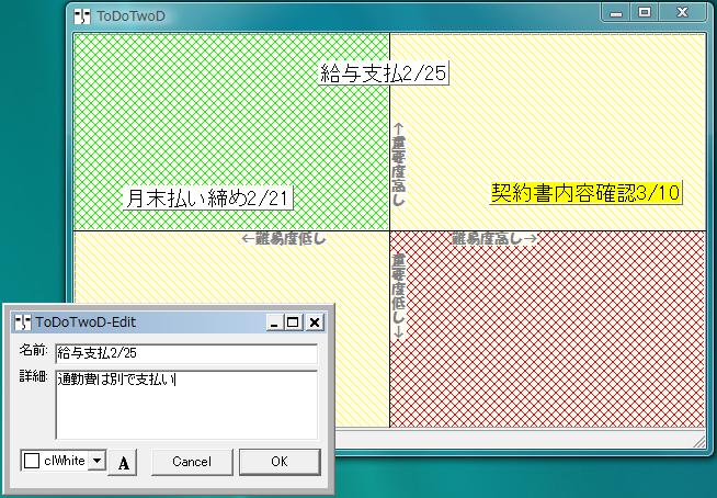 「重要度」と「難易度」によって分けられたマトリクスに自分でToDoを追加していくものです。デスクトップにおいて使ってみようと思っています。